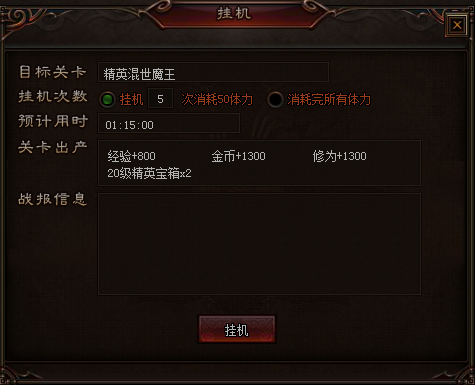 2、开始挂机后,消耗对应体力和一定时间即可轻松获得通关奖励