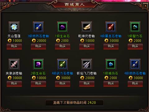 西域商人,主要出售的是各种低级宝石、宝石制作卷轴、天地宝库宝物卷轴等道具。只要使用低廉的金币价格即可购买相应的玩家稀缺道具,但西域商人里的道具并不是无限供给的,购买一个道具后,需要一定的冷却时间后才会刷新一个随机道具。小伙伴们,有空的时候就要拜访一下西域商人,看看有没有刷新你需要的道具吧!