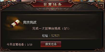 玩家通过完成各种日常任务获得丰富的经验奖励,日常任务大致有竞技挑战、连续击杀、强化技能、强化装备、斩妖除魔等任务类型。