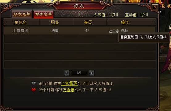 “对手名单”内是玩家通过“添加对手”获得的对手名单,如果看这个小伙伴不顺眼,就可以向他“吐口水”,不但可以减低对方的人气值,还可以快速地增加自身互动值。但请记得,互动值每天有一定的次数限制哦。