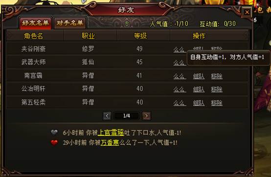 “好友名单”内都是玩家添加的好友,每日通过“么么”功能,可以增加自身互动值和对方人气值,累积到一定数量的互动值,即可领取相应的活动礼包。好友名单的组队功能,更是方便玩家一起组队杀怪的一大措施。