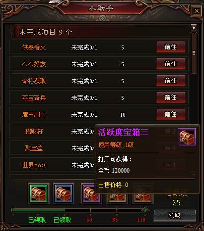 小助手会列举玩家每天在游戏内可完成的游戏内容,只要完成相应的游戏项目,即可获得相应的活跃度,累计到一定的活跃度即可领取相应的活跃度宝箱。活跃度宝箱不但提供可观的金币奖励,高级宝箱还有可遇不可求的元宝奖励哦,只要小伙伴们多多参与活动,这些奖励都是手到擒来,万无一失的!