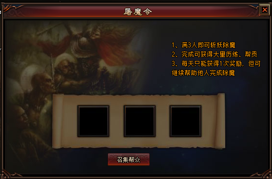 1.集齐三名帮众即可斩妖除魔,完成屠魔令;