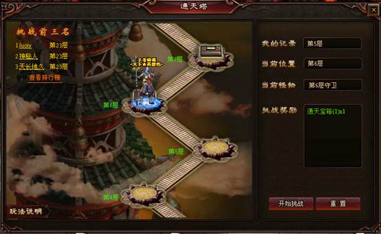 点击老传奇主界面上排的“通天塔”图标,即可进入通天塔的主界面。